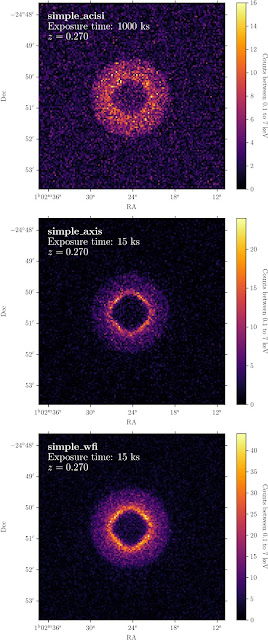 Simulated X-ray observations by Chandra (top), AXIS (middle), and Athena (bottom). The planned AXIS and Athena missions could achieve higher signal to noise than Chandra can in far less time. Credit: Lin & Yang 2024