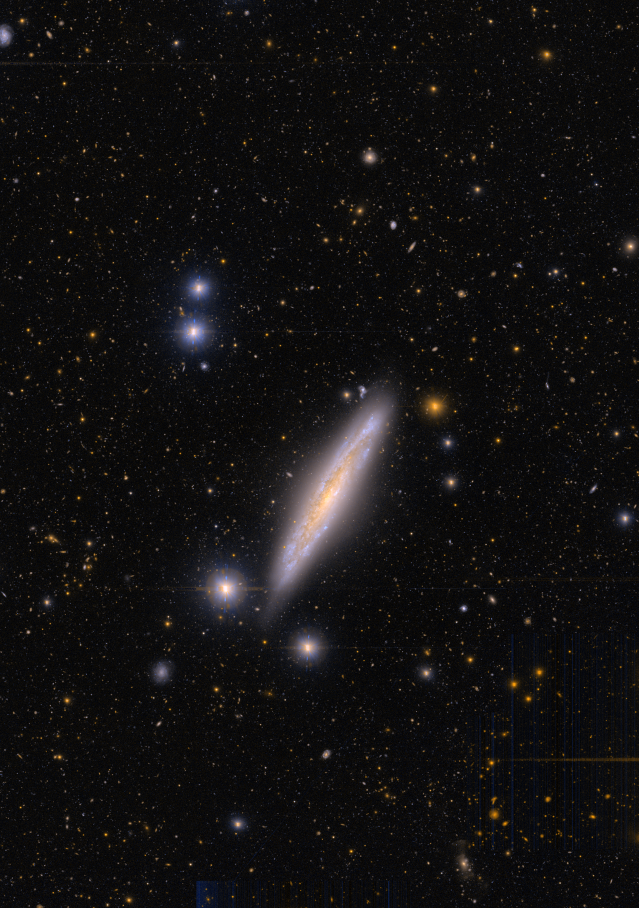 NGC 5301 is a spiral galaxy located in the constellation Canes Venatici. This edge-on galaxy features prominent dust lanes that stretch across its entire galactic disk. The striking contrast between the reddish central region and the bluish spiral arms enhances its beauty. Compared to NGC 5211 , a face-on spiral galaxy, this image illustrates how the inclination of a galactic disk can significantly change a galaxy's appearance. Since we can only observe a single galaxy from one angle, observing and comparing multiple galaxies with different inclinations is essential for understanding galactic structure.